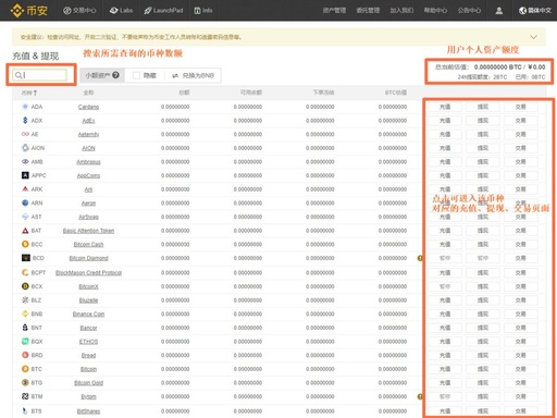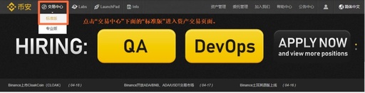 步骤十:交易操作进行交易前需要注意:币安只支持币币交易,不支持法币交易与C2C交易,想要在币安进行交易的用户需提前充币进币安账户,币安目前有BTC、ETH、USDT、BNB等交易对切换区。