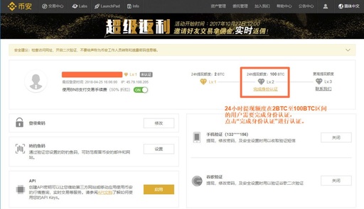 24小时提现额度在2BTC至100BTC区间的用户需要完成身份认证,点击“完成身份认证”进行认证。