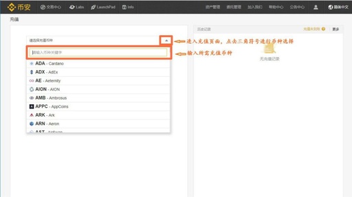 进入充值页面,点击三角符号进行币种选择,搜索所需充值币种。