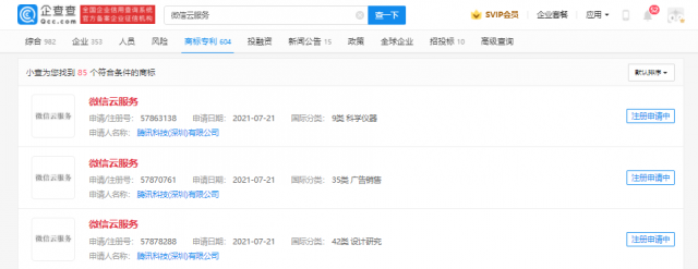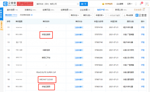 【TechWeb】企查查APP显示,近日,腾讯科技(深圳)有限公司申请注册多项“微信云服务”“WECHAT CLOUD”商标,国际分类含科学仪器、广告销售、设计研究等,当前商标状态均为注册申请中。